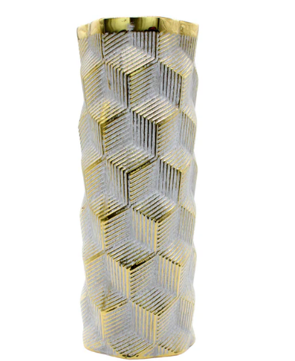 The Tall Geometric Light Grey and Gold Vase features a striking modern design with angular patterns and a sleek finish. Its elegant combination of soft grey and metallic gold adds a luxurious touch, making it a perfect statement piece for any decor.