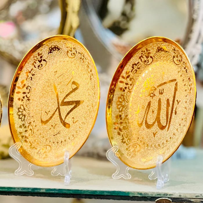 Express your faith in style with the GrabGifts Shining Allah & Mohammad Name Plate, a beautifully crafted Islamic decorative showpiece. Made from premium ceramic with a gleaming gold finish, this piece features the names Allah and Mohammad (PBUH), making it a meaningful addition to your home, office, or prayer space.